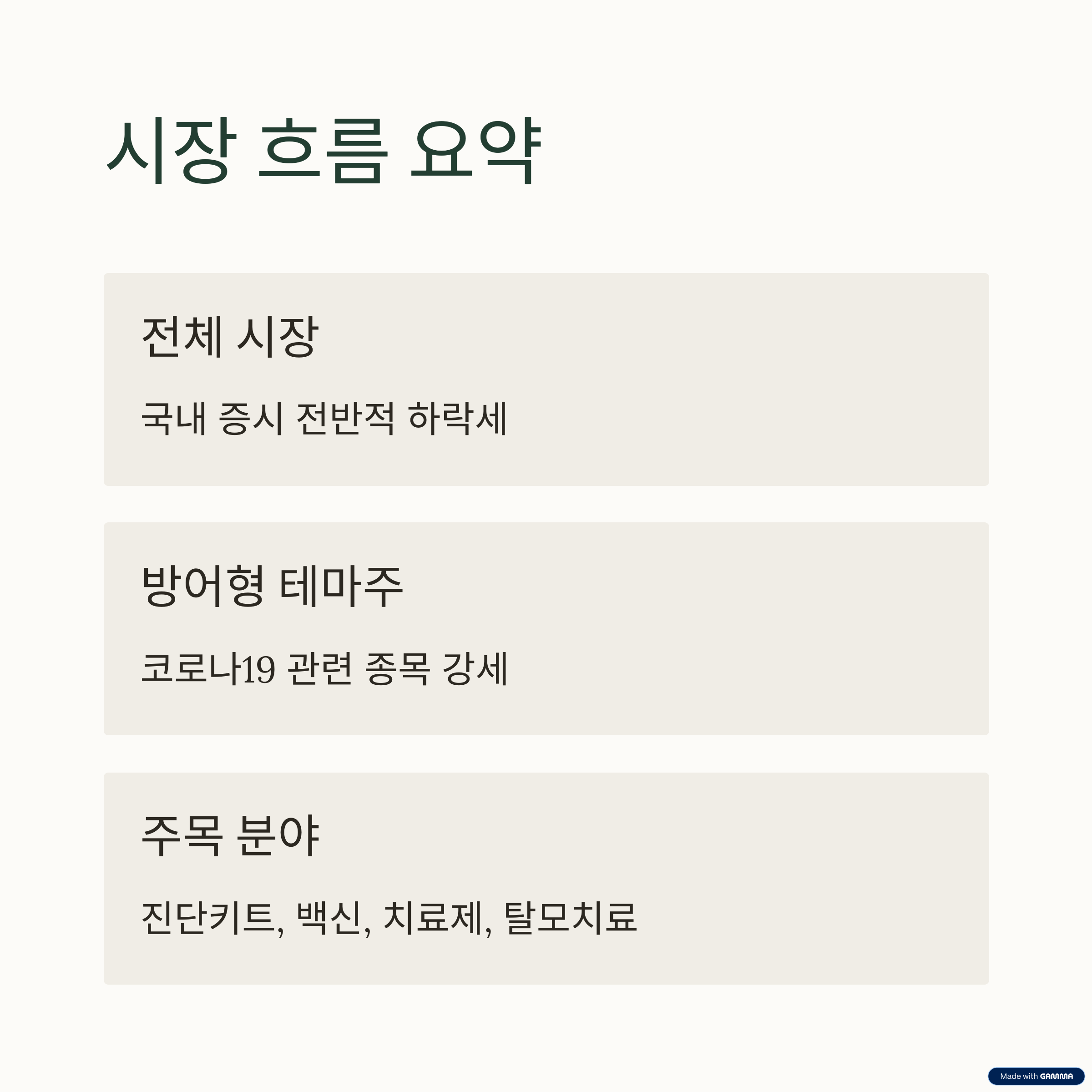 2025년 5월 22일, 국내 증시는 전반적인 하락세를 보였으나, 코로나19 재확산과 관련된 방어형 테마주들이 강세를 나타냈습니다. 특히 진단키트, 백신, 치료제, 탈모치료 등과 관련된 종목들이 상한가를 기록하며 시장의 주목을 받았습니다.